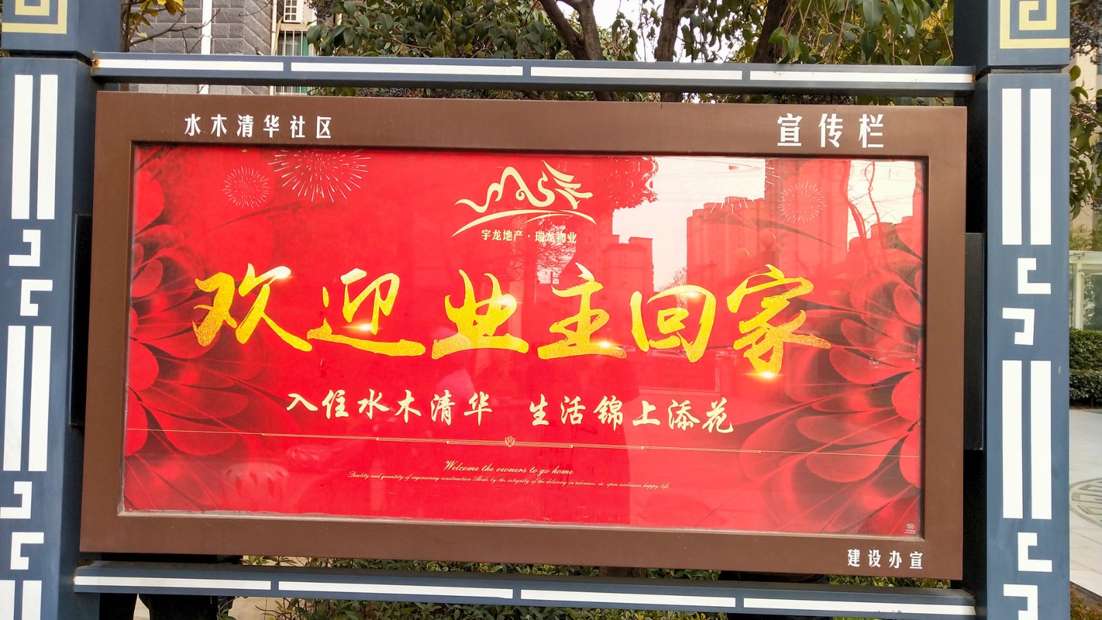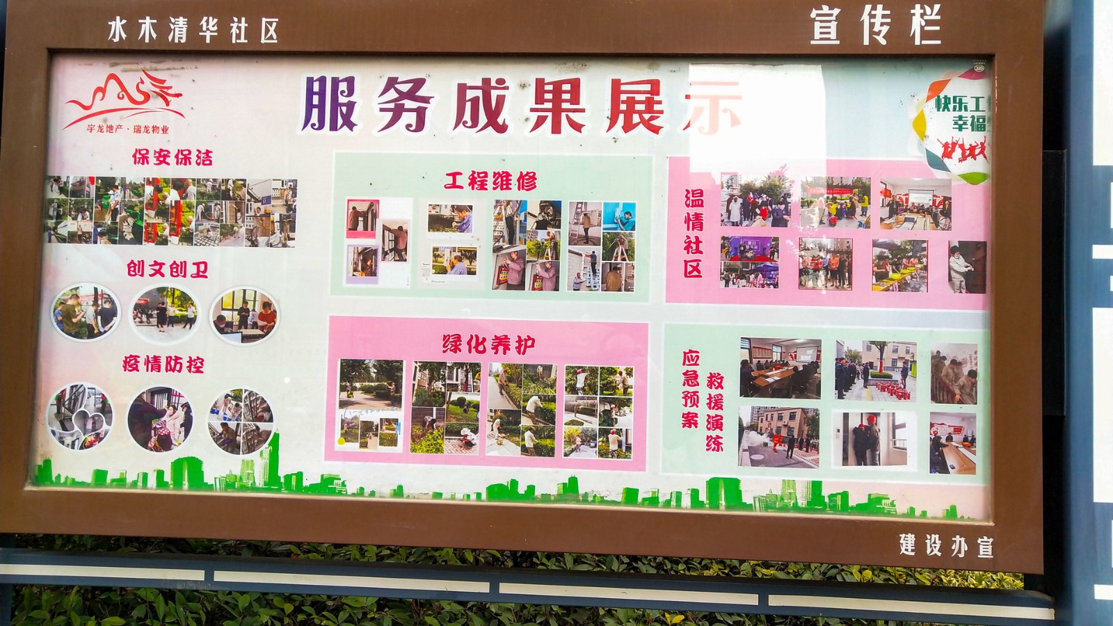 新年新氣象,水木清華一期、二期統一更換宣傳板塊,新增歡迎語版面、年度服務成果展示版面、物業管理范疇版面等,新版面提升小區品牌形象。