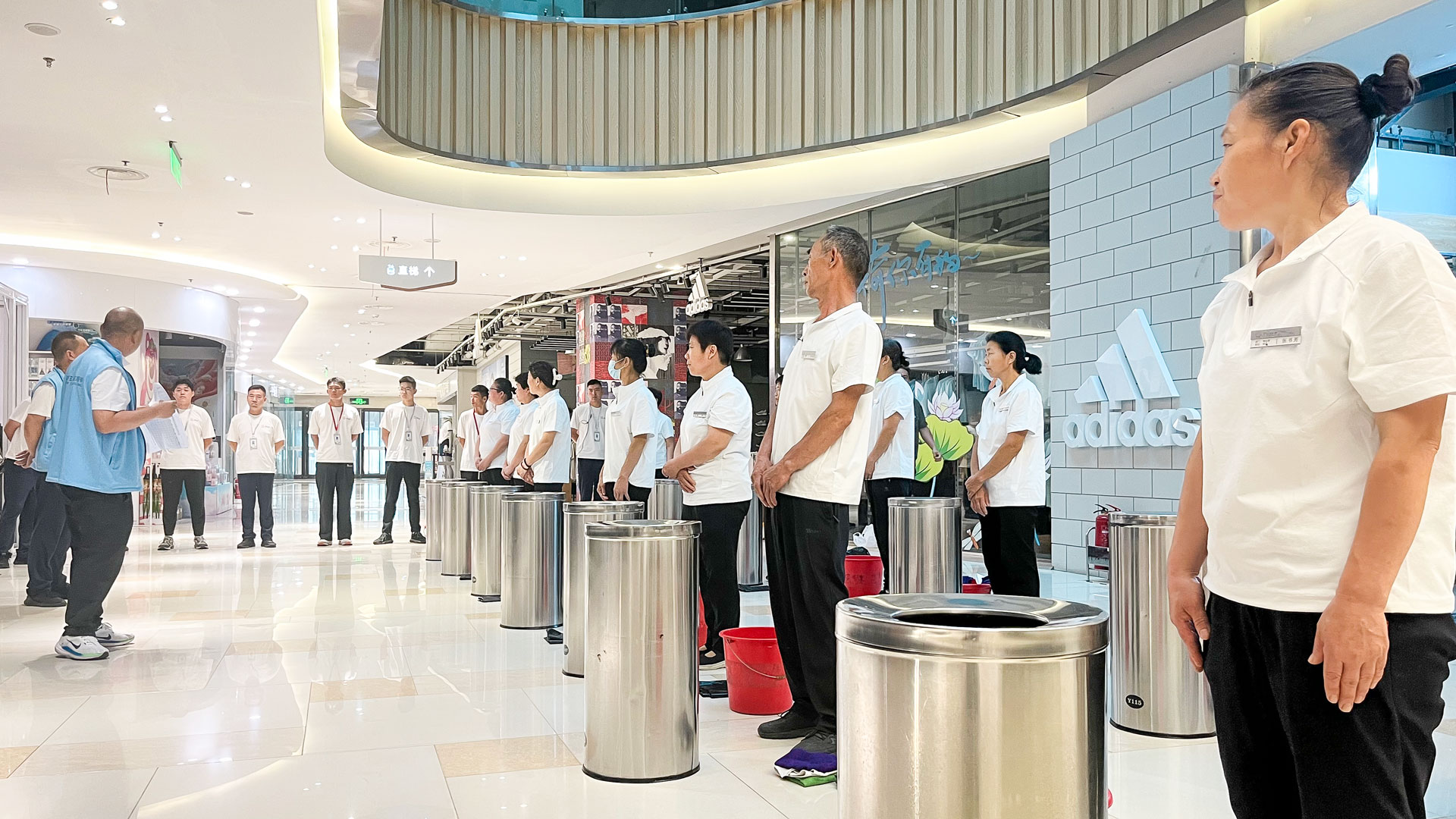 活動伊始,保潔科在一樓西廳組織進行垃圾桶清潔與套袋實操比拼,作為基礎但關鍵的服務環節,簡單的套袋工作,在如何快速卡緊、避免松動等細節上有很多技巧。套袋的緊密程度和更換效率直接影響顧客體驗。此次跨崗位交流為安保人員提供了學習機會,也促進了服務流程標準的統一。