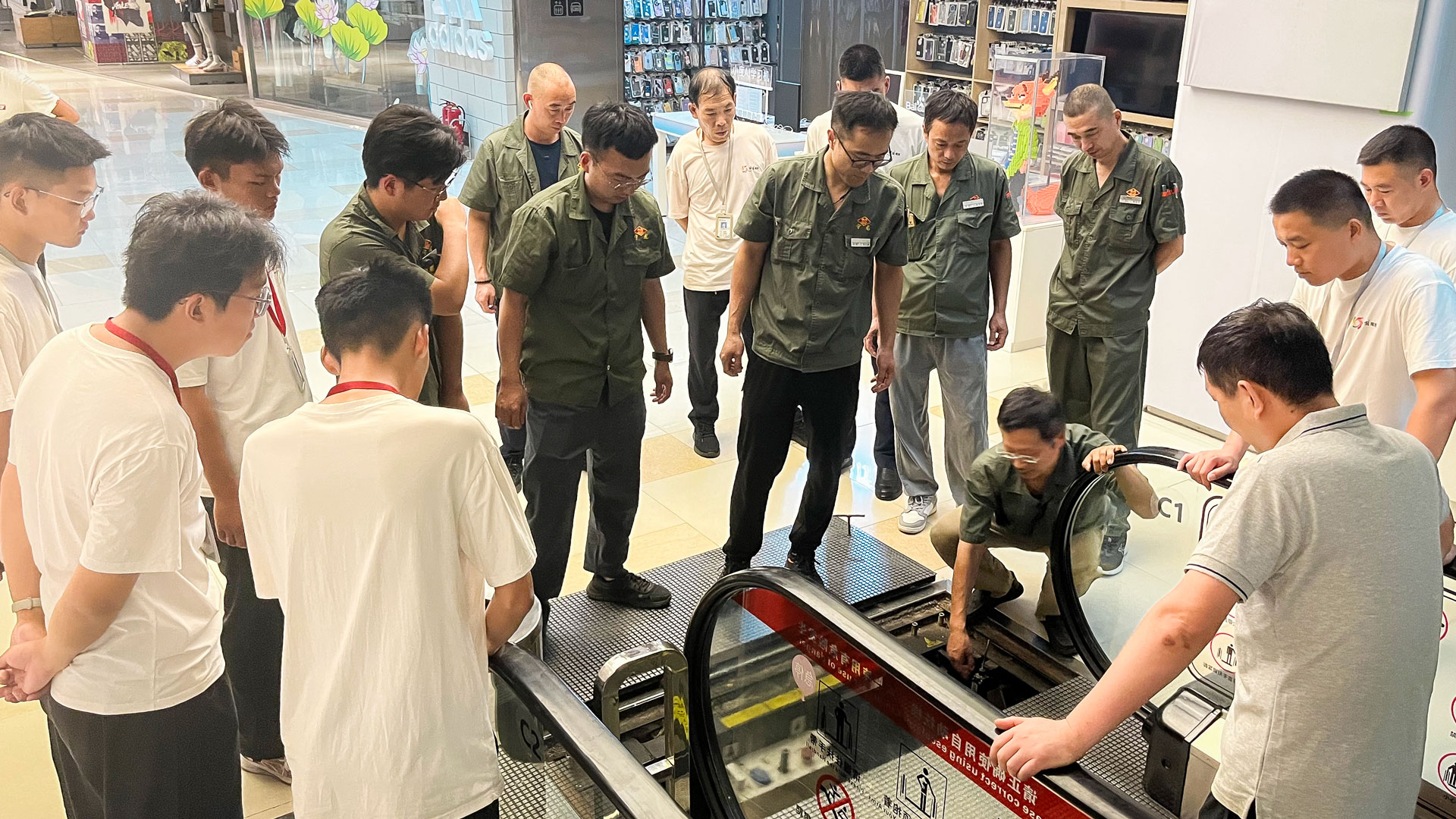 在電梯安全培訓環節,水電維修中心電梯維保負責人聚焦廣場電梯日常運維中的高頻問題,包括梳齒板異常、防夾裝置觸發等故障代碼識別與常見故障解析。建議大家在報修時同步提供故障代碼,以提升維修效率?,F場更是向大家演示了直扶梯的盤車操作、平層定位等關鍵技能,重點強調了“斷電優先”的原則,整體強化了參訓人員的故障判斷與應急處理能力。
